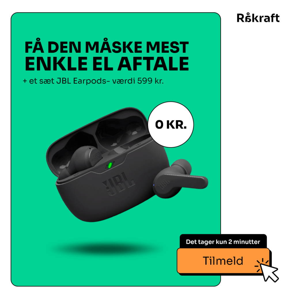 Med Råkraft får du el til rå indkøbspris for kun 49 kr. om måneden. I forbindelse med lancering, giver vi de første 200 kunder et par JBL EarPods til 0 kr. Tilmeld dig på to minutter nu.